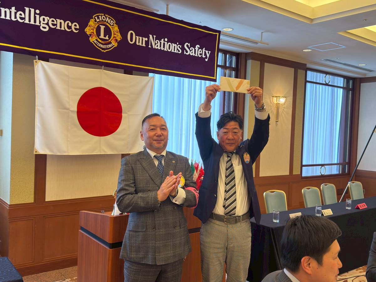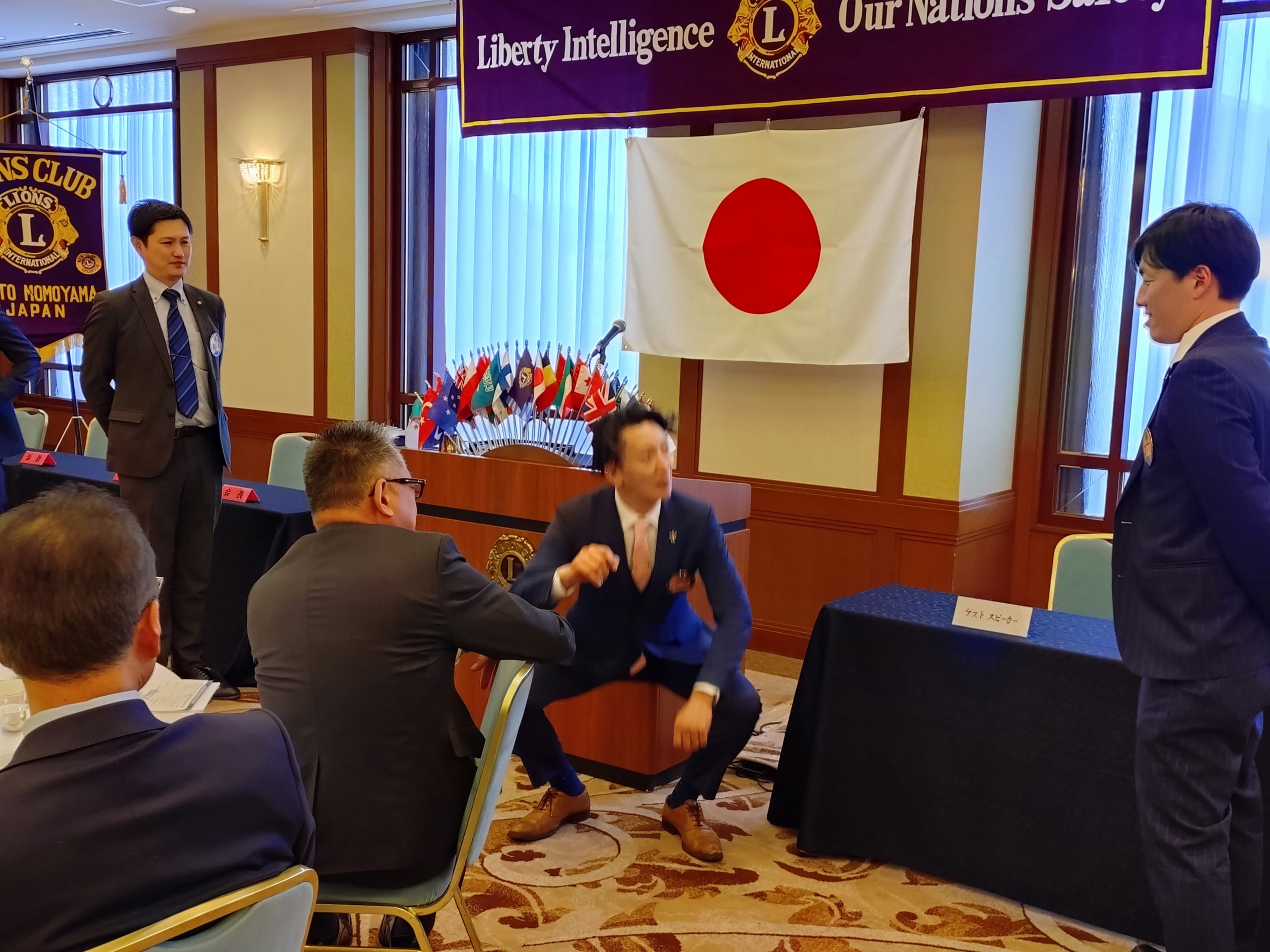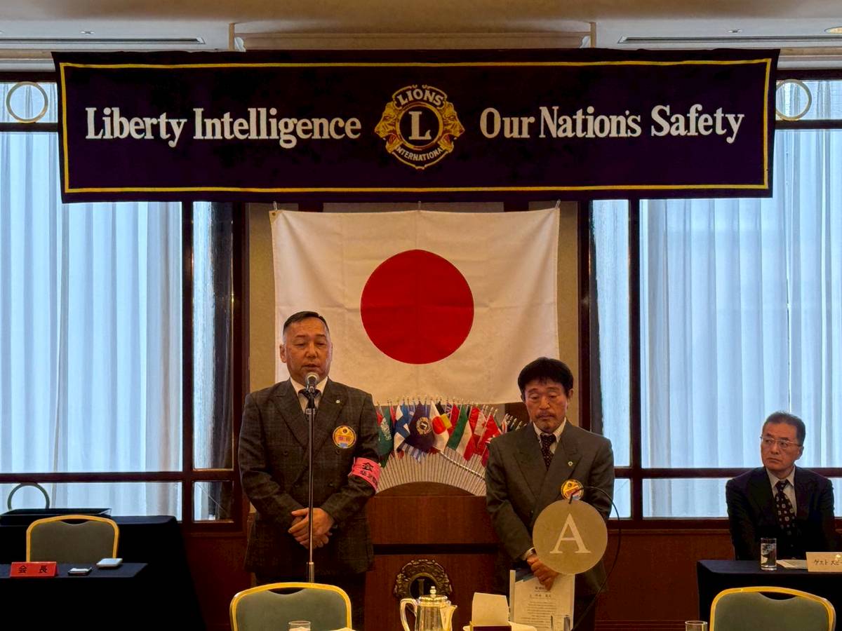 開会のゴングに続き、国家「君が代」斉唱と「ライオンズヒム」の合唱が行われ、新会員入会式が行われ、L川本の入会が承認されました。