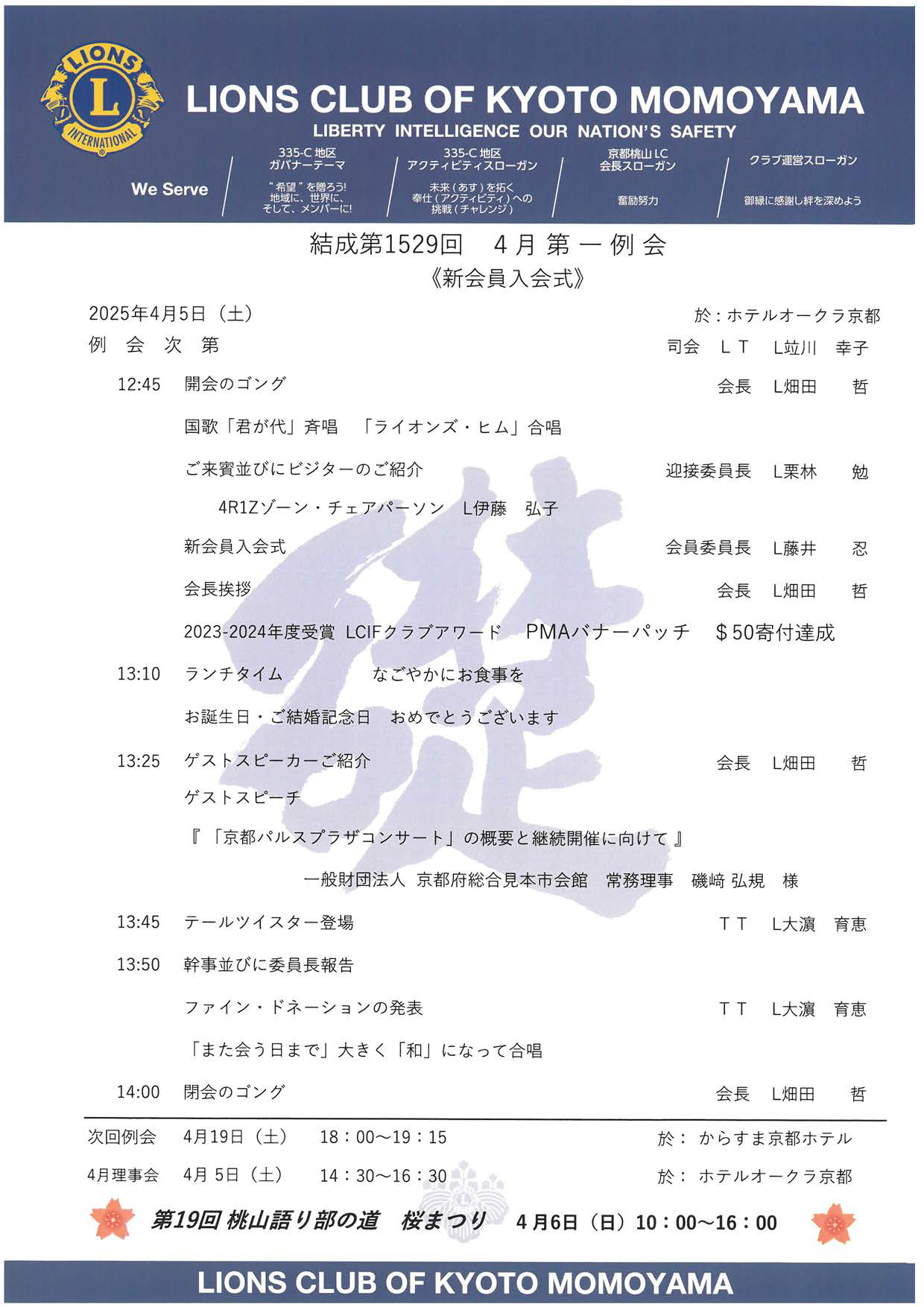 本日(4月5日)、結成第1529回4月第一例会・新会員入会式がホテルオークラ京都にて開催されました。
