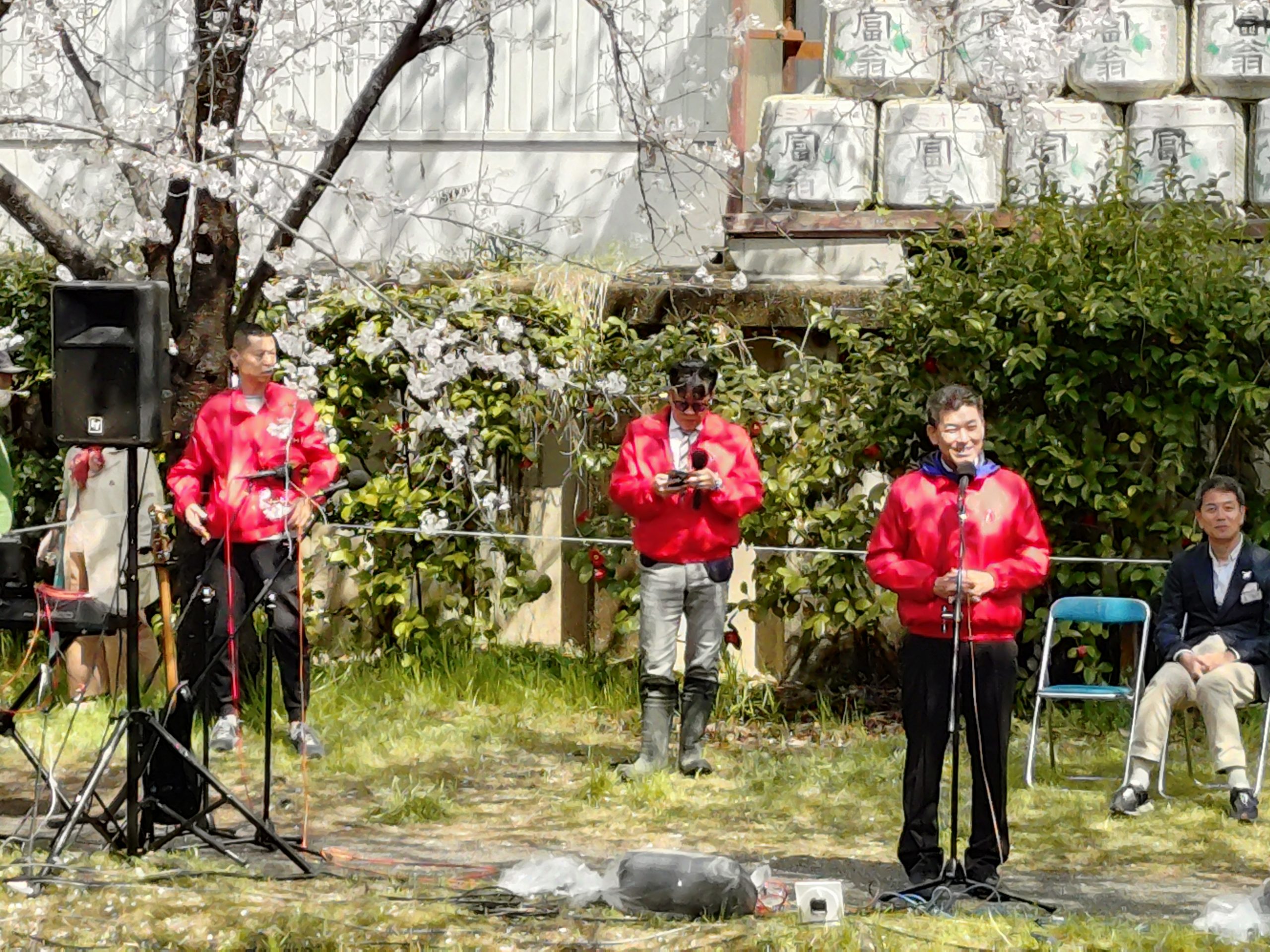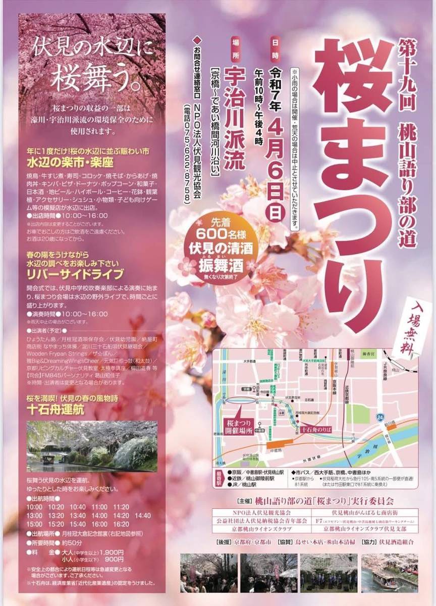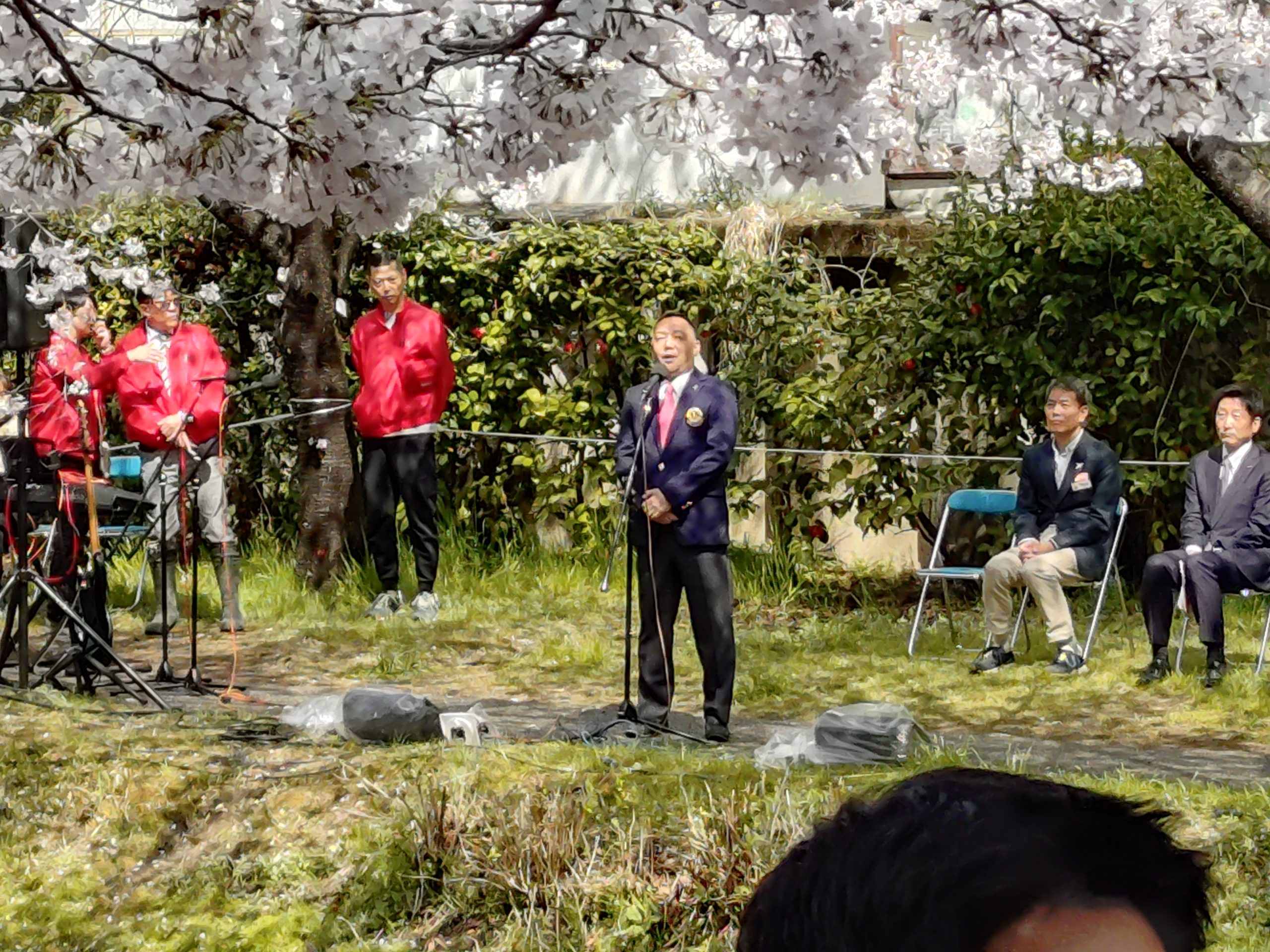 第19回桃山語り部の道桜祭りが満開の桜で開催されました。 2025.04.06 その他報告 第19回「桃山語り部の道桜まつり」が満開の桜の下で開催されました。 「桃山語り部の道桜まつり」は、京都桃山ライオンズクラブの最大のアクティビティーとなっております。 開始6時ごろは、雨が降ったり止んだりしておりましたが、その後出席メンバーや実行委員会の皆様のご協力のもと、水のかきだしなども行い、なんとか気持ちよく開会式には間に合わせていただきました。 本年も、満開の桜のもと、開会式からは天候にも恵まれ、たくさんのお客さまにご来場いただくことができました。 環境保全委員長のL谷山をはじめ実行委員会の皆様、準備や告知、会場掃除など諸々お疲れ様でした。 感謝 前へ トピックス一覧 次へ 63期のあゆみ