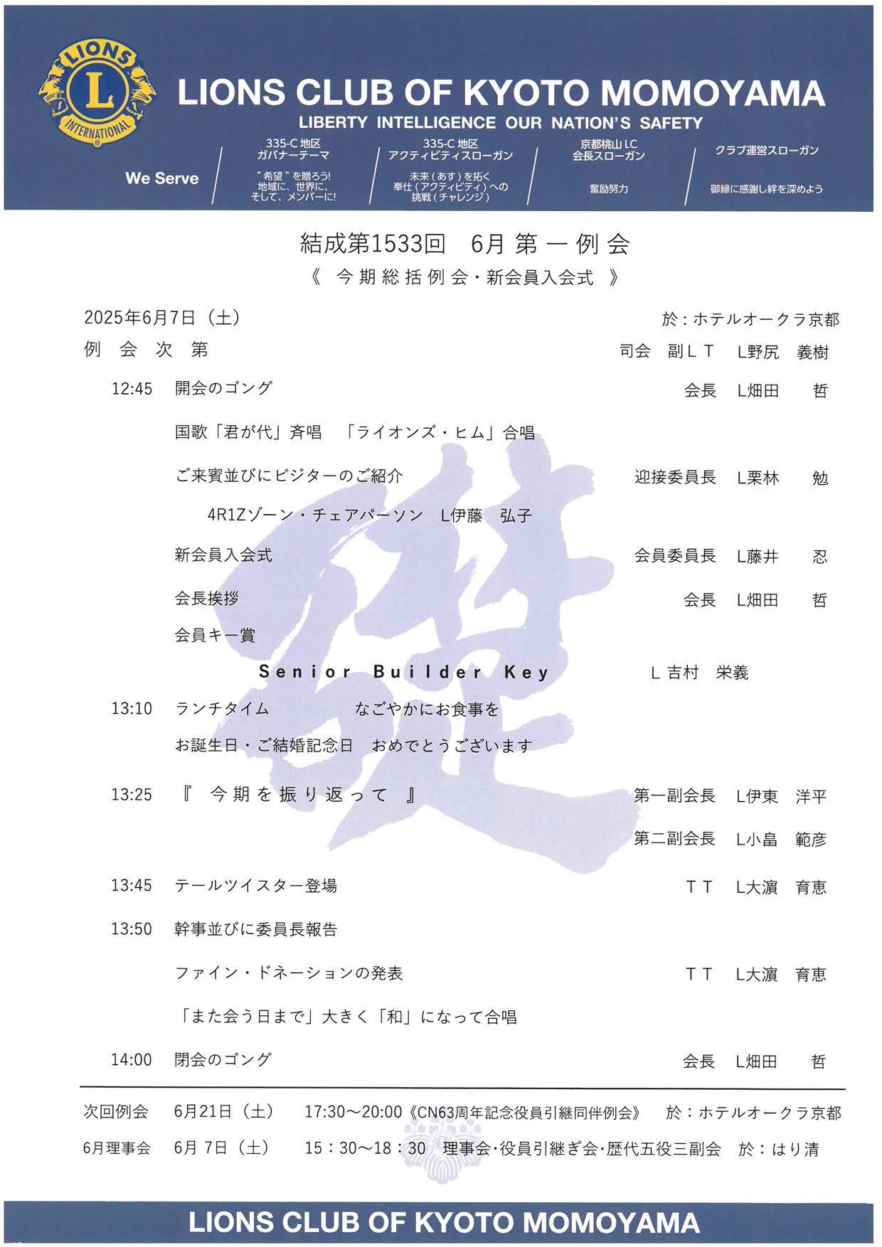 本日(6月7日)、結成第1533回6月第一例会がホテルオークラ京都にて開催されました。