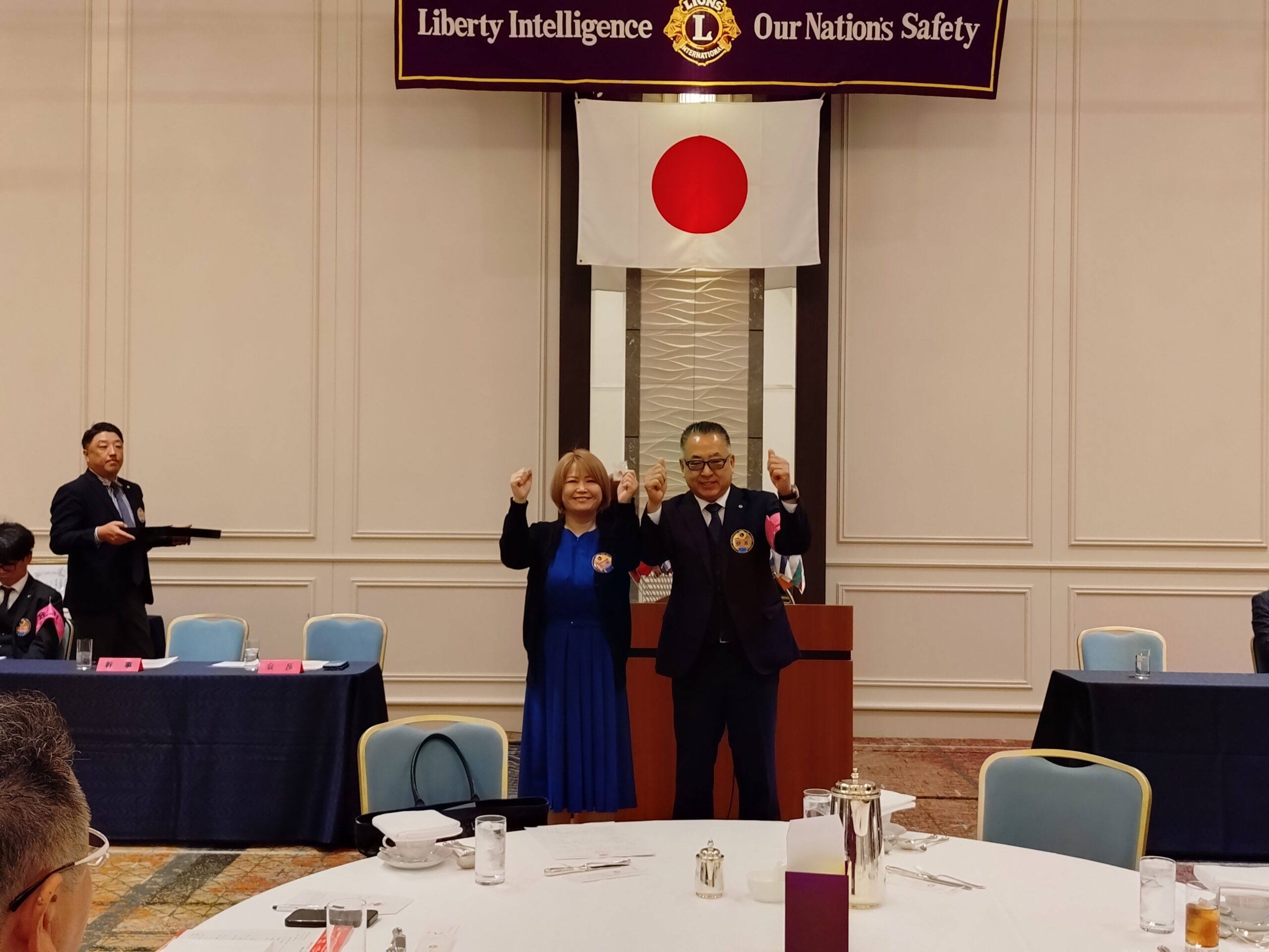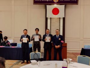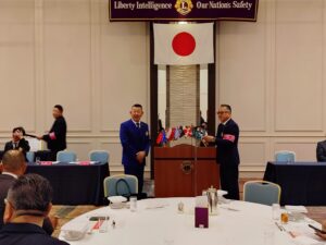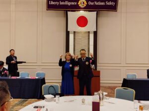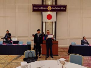 続いて、MISSION 1.5「女性会員が入会したクラブへの日本独自表彰」が行われました。また、マイルストーン・シェブロン・アワードとして、30年のL瀧井義郎、15年のL西村直樹、10年のL藤井哲也・L谷山真敬の各氏が表彰されました。さらに、新会員L久米珠見に対して「2025-2026年度 多目的ピン」の贈呈が行われました。