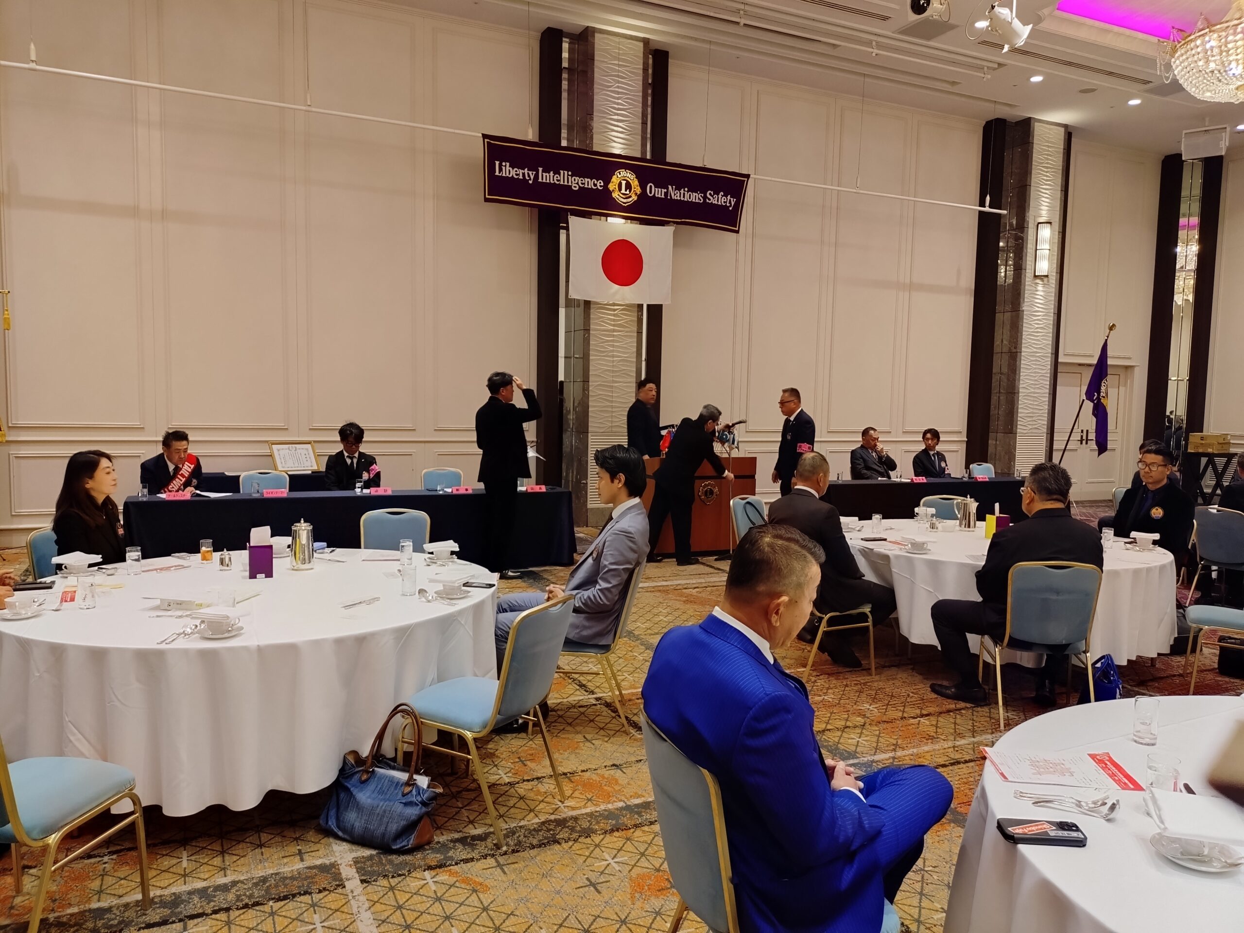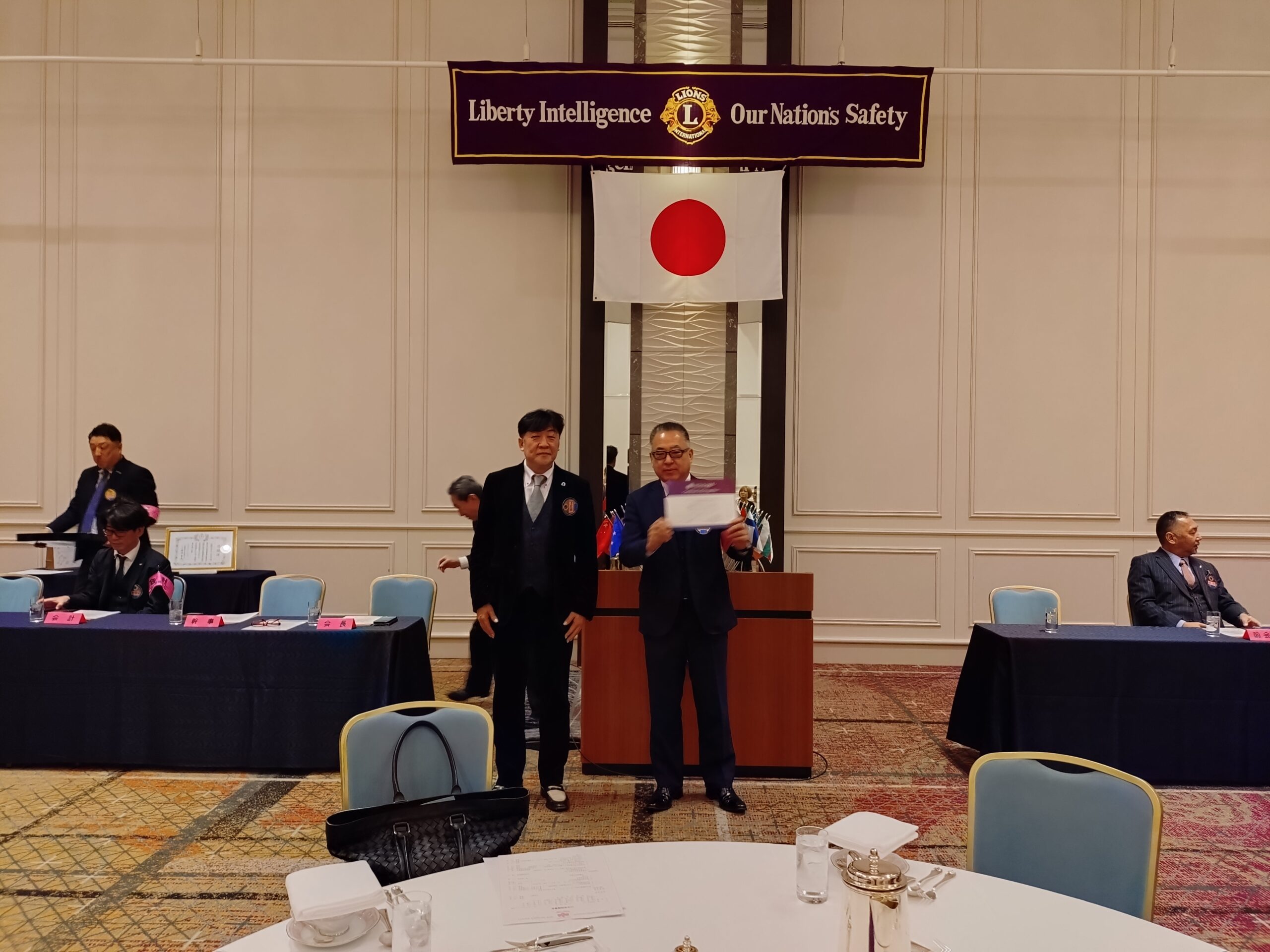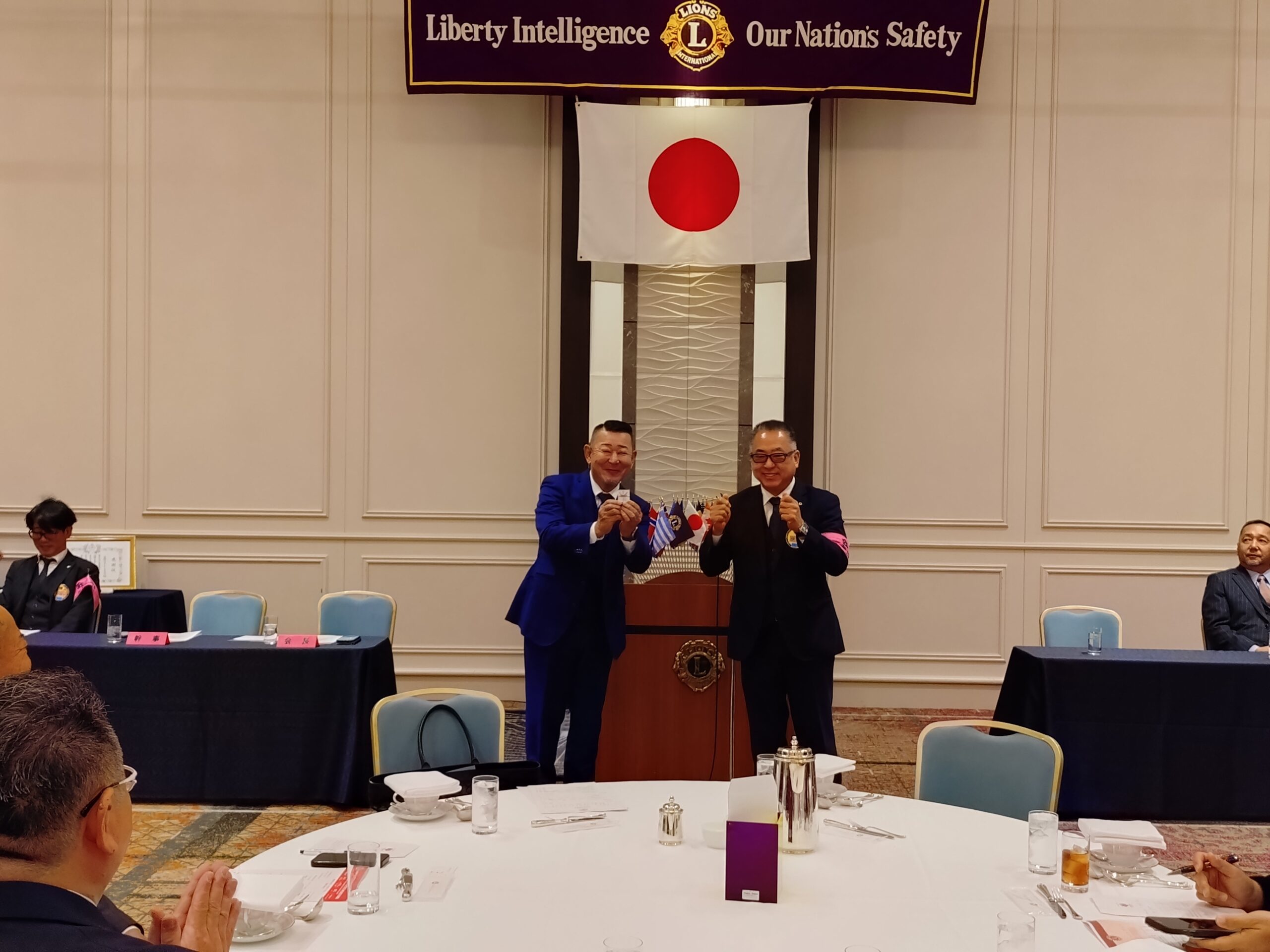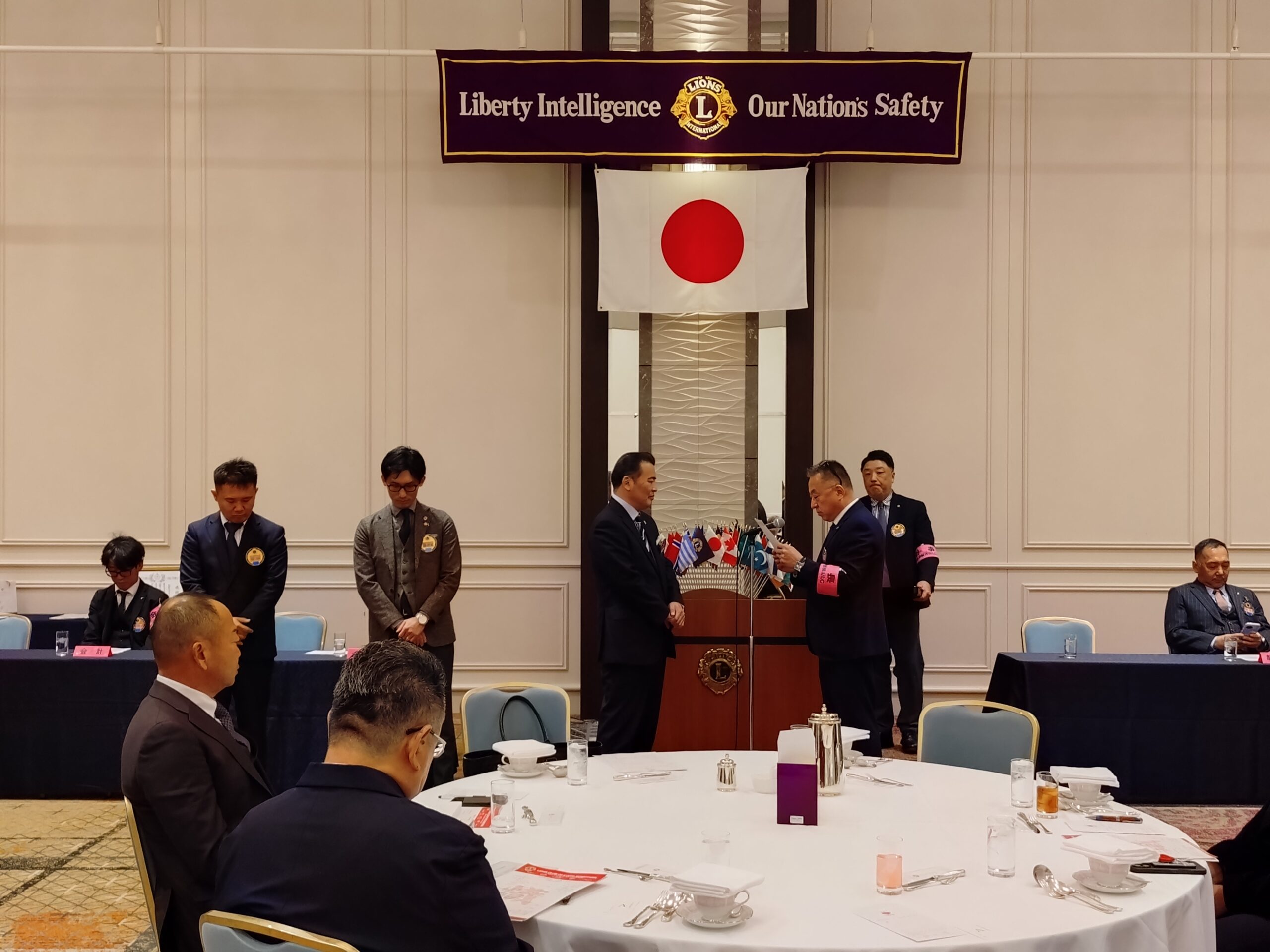 開会のゴングに続き、国歌「君が代」斉唱、「ライオンズ・ヒム」合唱、「ライオンズ道徳綱領」朗読が行われ、厳かな雰囲気の中、例会がスタートいたしました。