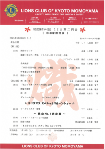 本日(12月20日)、結成第1546回 12月第二例会《忘年家族例会》がホテルオークラ京都にて開催されました。