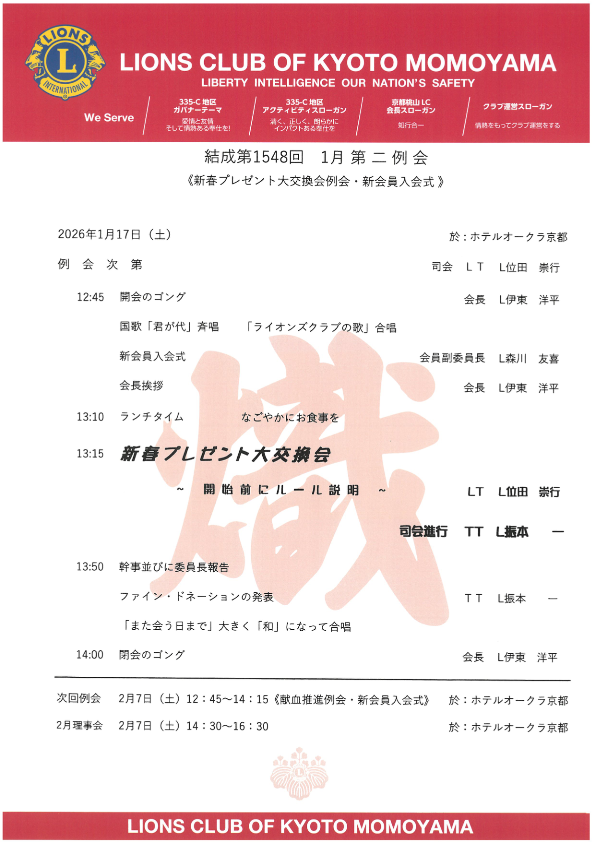 2026年1月17日(土)、ホテルオークラ京都にて結成第1548回 1月第二例会が開催されました。